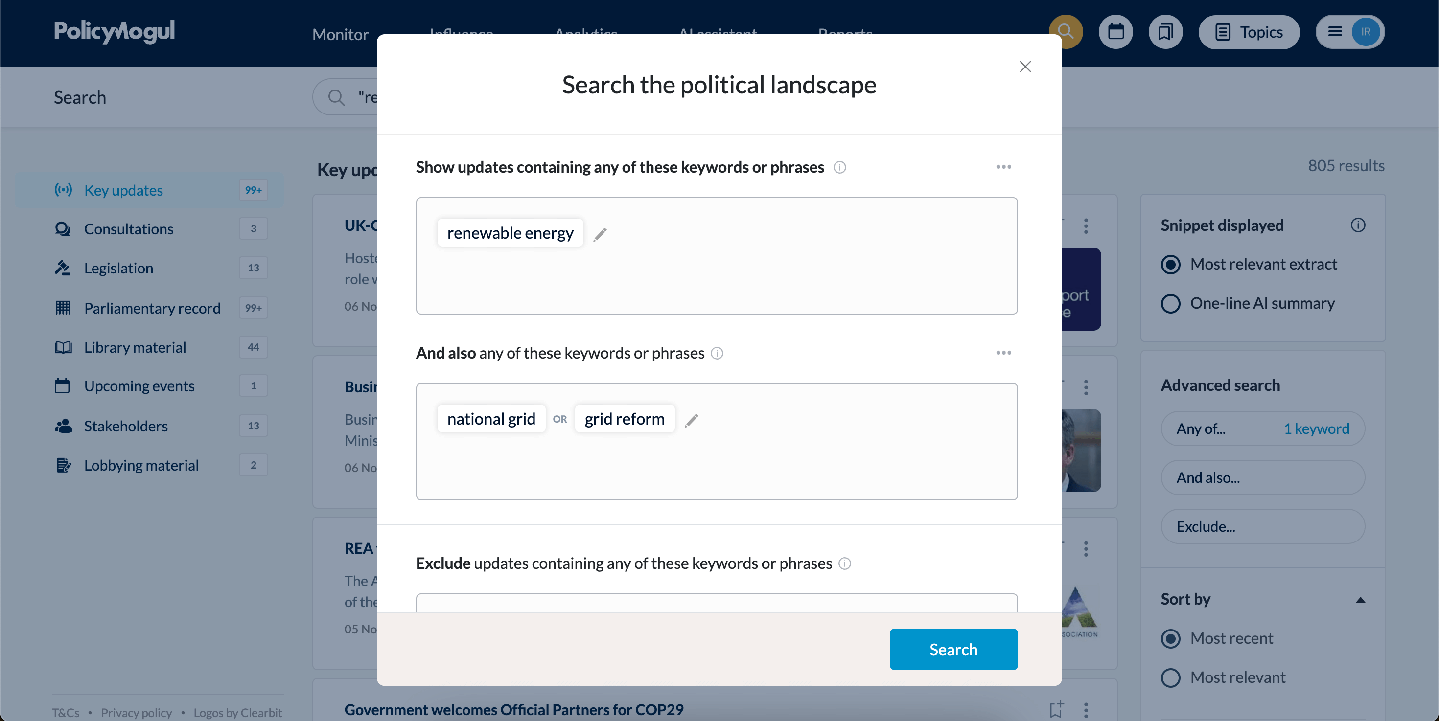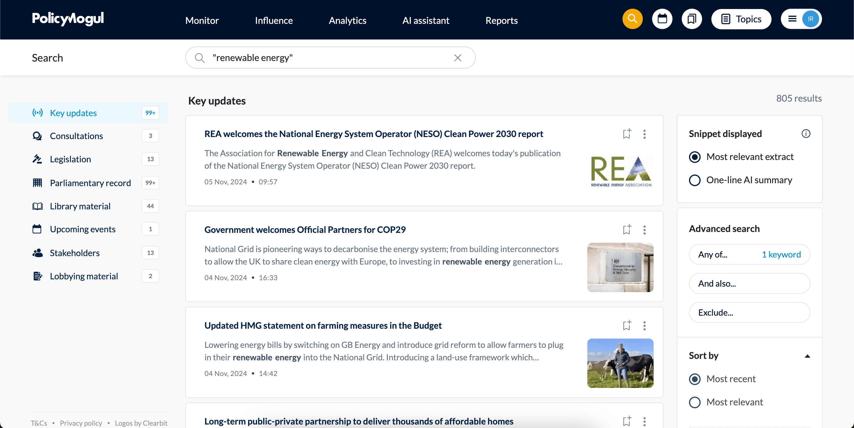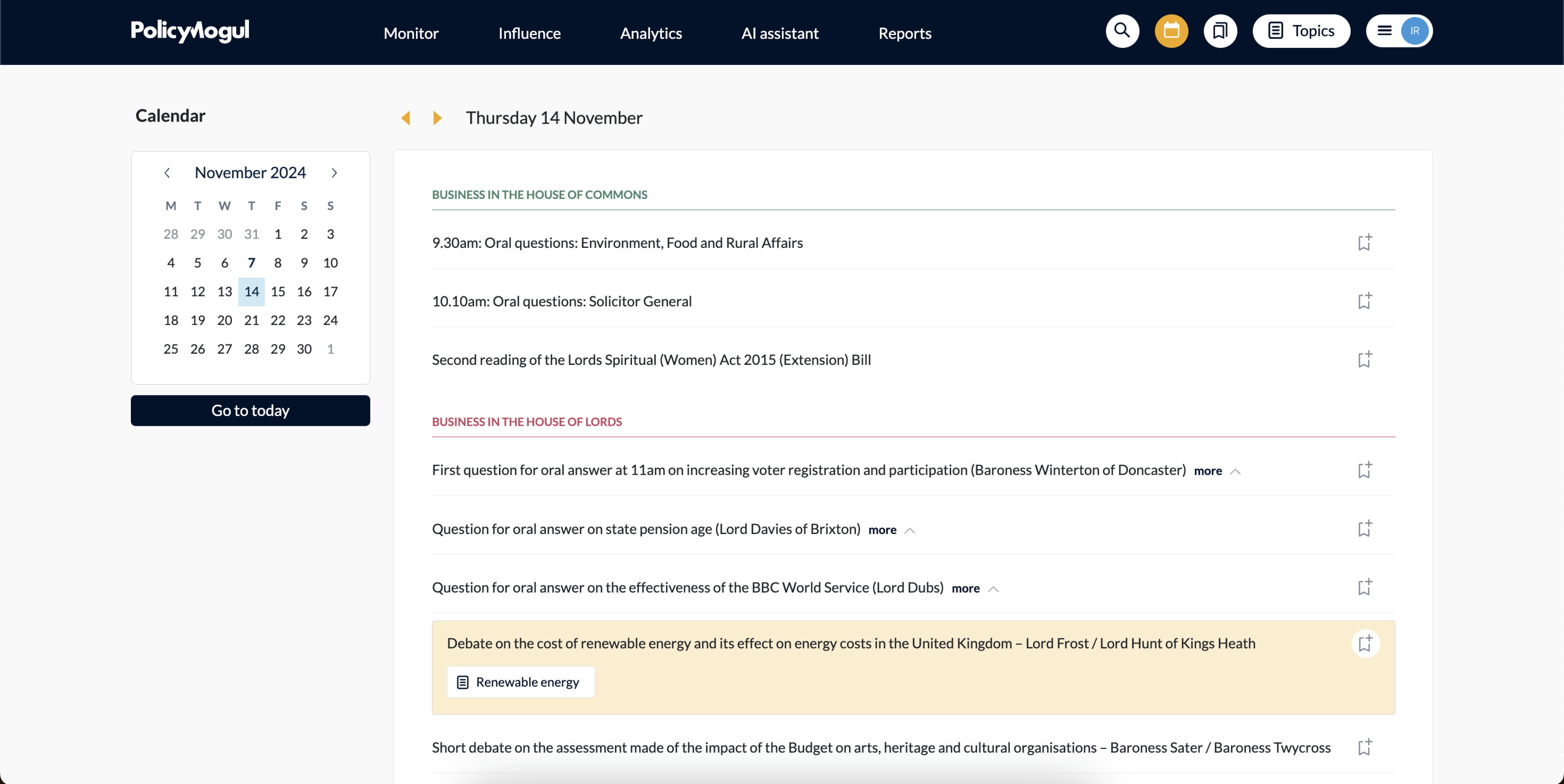 PolicyMogul’s research offerings are twofold. Firstly, our platform provides comprehensive political data tools, including advanced search and filtering, analytics and a political calendar, enabling you to navigate and understand the political landscape with ease. Secondly, depending on your subscription type, our experienced research team acts as an extension of your own team, available to provide support such as real-time coverage of meetings, guidance on parliamentary procedure, and more.